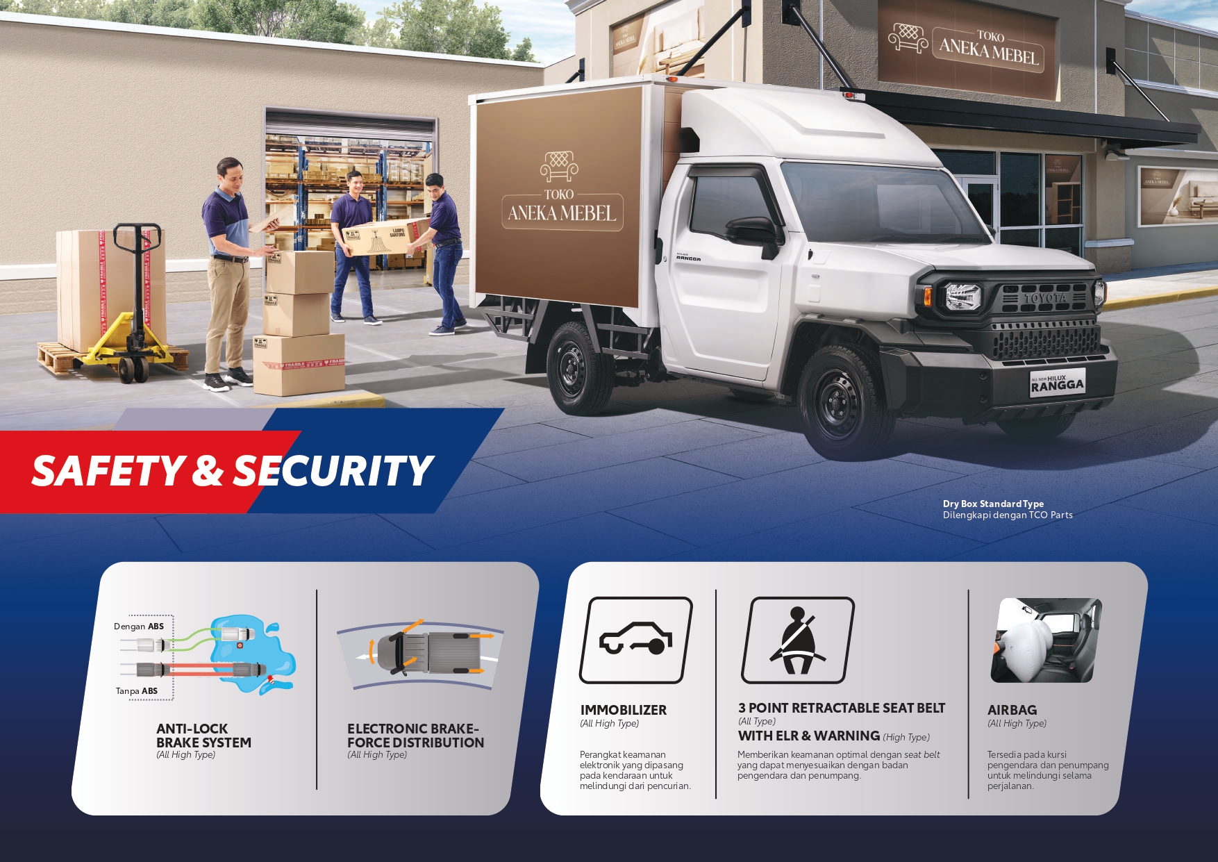 Keamanan pengguna dijaga oleh 3-points seatbelt, airbags, immobilizer, side body under run, cabin protector, fitur ABS+EBD pada rem cakram 14 inch di depan, rem tromol di belakang, bonnet, hingga Vehicle Stability Control (VSC) dan Traction Control (TRC).